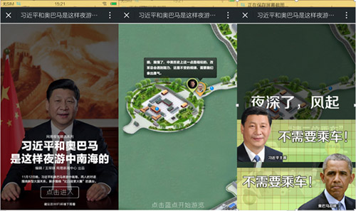 首先获此殊荣的是网易新闻中心的《习近平和奥巴马是这样夜游中南海的》。它是一篇“可视化”新闻,除了生动的图片,更多信息通过动画效果呈现出层次感和互动感,就像一个flash动画一样,把中美两位政治大佬的夜游中南海的信息传播得通通透透,各种场景切换,使读者如临其境、如见其人、如闻其声。