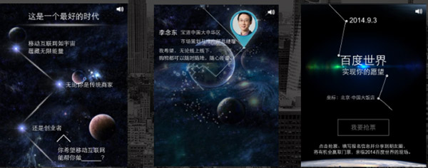 标杆案例如今年的百度世界大会,将会议邀请和星空元素紧密结合:在一片唯美的星空背景之上,每划过一道流星,就浮现出一位意见领袖对移动互联网的看法和愿景,最后是会议的时间地点,并可进行在线抢票。(#纳尼,又是百度的?!小编就不展开说了,夸那么多一分钱没收到何必呢?#)