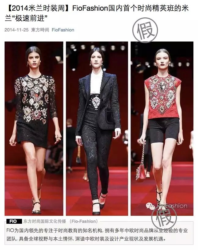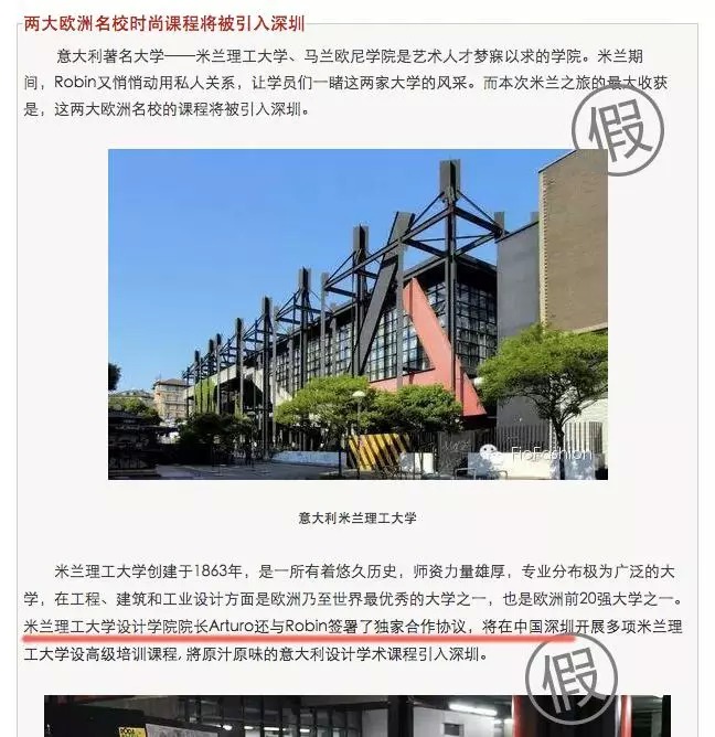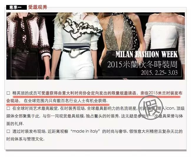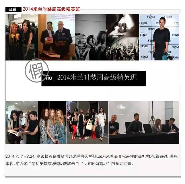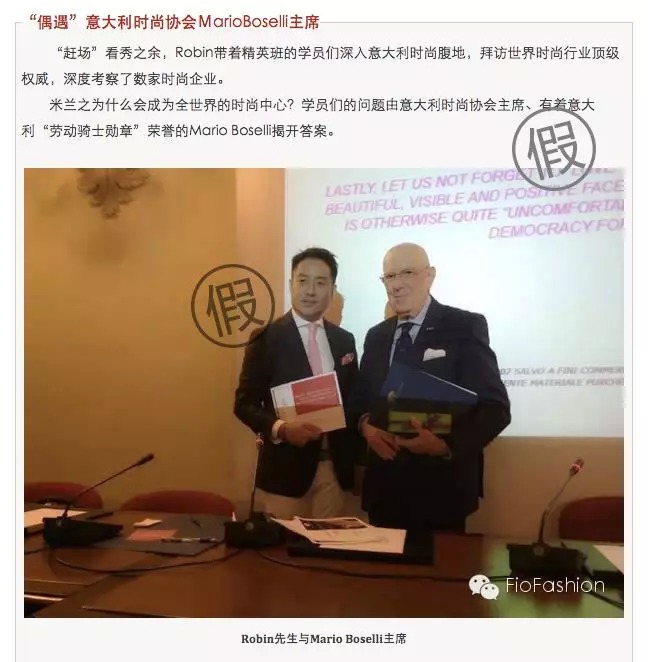 然而,自2014年9月份以来,在米兰时装周上奇迹般的出现了一个似是而非,牵强附会,李代桃僵、藏头露尾的某城市的东方时尚文化传播有限公司的“时尚精英班”,把意大利全国时尚协会及其主席MARIO BOSELLI主席启动开学仪式,米兰理工大学设计学院院长ARTURO DELLACQUA BELLAVITIS签署独家合作协议等内容堂而皇之的写入招生介绍和文案里。