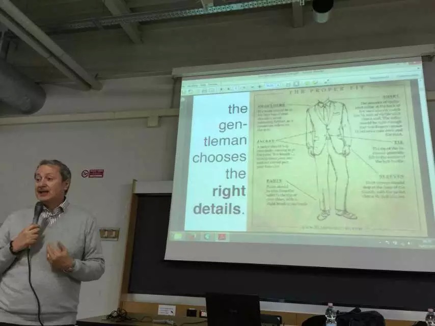 2015年2月的当下,学员们正在米兰时装周期间进行学习参观,上图为前方发来的课程掠影。米兰理工大学设计学院院长Arturo教授在跟大家讲课。