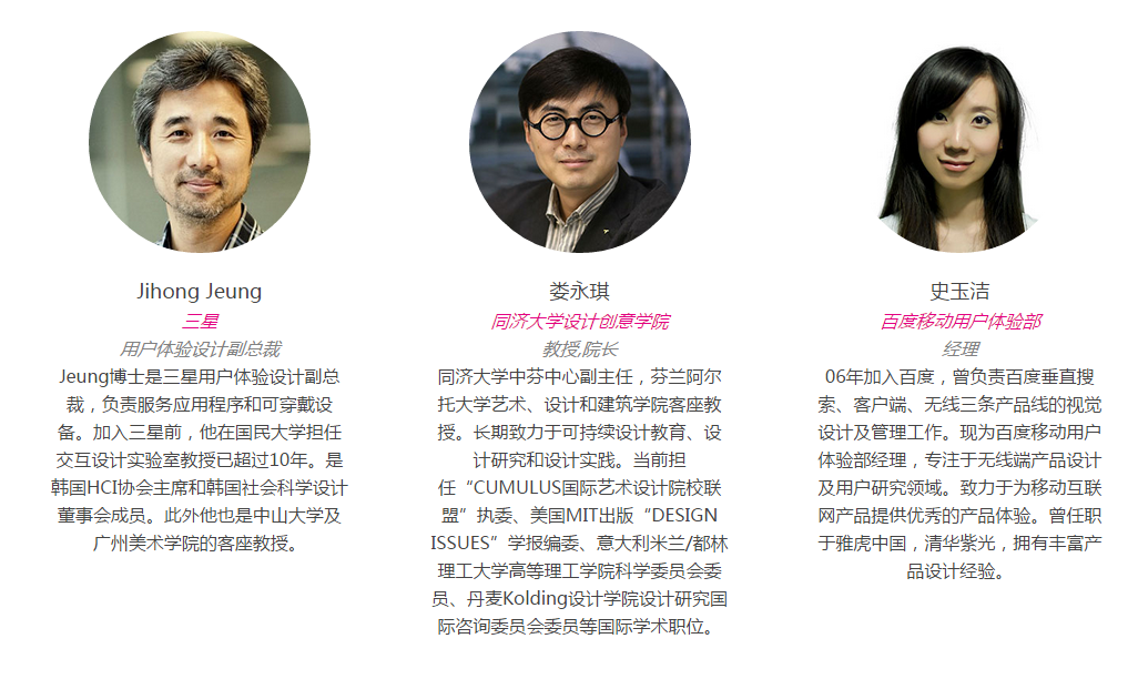 大会主讲人已确认出席的有三星用户体验设计副总裁Jihong Jeung、同济大学设计创意学院教授,院长娄永琪、百度移动用户体验部经理史玉洁。更多主讲人还在邀请中,敬请期待。