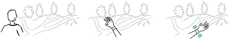 如果遇到岔路,或是前方路径无法被定义,那么可以伸出手向不同的方向试探,当指向着目的地的方向时,手表会产生震动,告诉你沿着怎样的方向继续走。