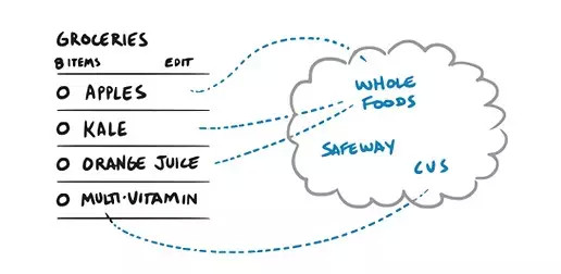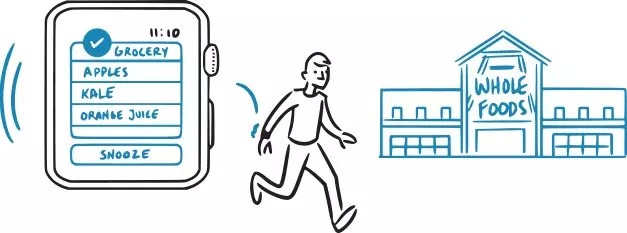 回到示例当中,譬如我知道这周我要买不少东西回来,而且不同的东西要在不同的地方买。对于新鲜蔬菜和海鲜,我要去全麦;肉要去Gartners'市场;其他乱七八糟的要去Safeway买。我希望事项清单能在我处于特定卖场的时候能自动提醒我购买相应的物品,例如当我抵达全麦时提醒我去买蔬菜和海鲜;应用自身应该可以基于我所在的地理位置以及在清单里勾掉的项目来学习我的行为模式。