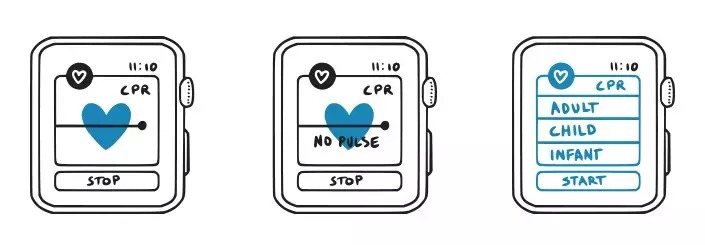 多数的紧急救治都需要你使用双手来完成,所以充分利用手表的功能来进行辅助,这是很好的思路,因为它本就被穿戴在你身上,无需手持。目前来说,Apple Watch在这方面是有着天然优势的,它可以测量心率,也可以在你帮他人进行心脏复苏时通过震动反馈来提供准确的按压频率参考,你甚至可以在没有参加过相关培训的情况下进行操作。