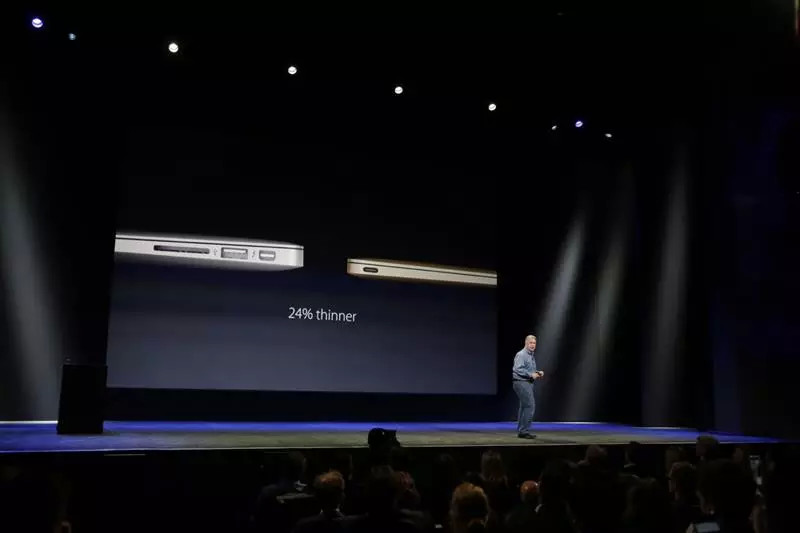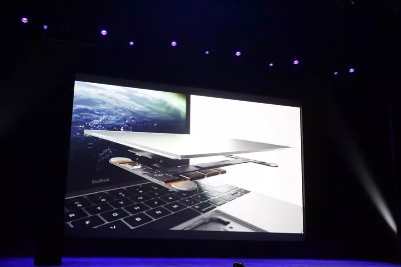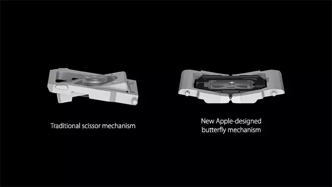这是迄今为止最轻的 MacBook,重量为两磅,还不到 1 千克。全新 MacBook 比 11 英寸 MacBook Air 还要薄 24%,最厚处为 13.1 mm。MacBook 内部首先被更新的是全新的全尺寸键盘,基础结构跟之前完全不同。全新的蝶式结构键盘,使按键薄了 40% 的同时,并且每个按键的表面积扩大 17%。