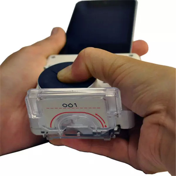 这是一款直接与智能手机耳机插口相连的插件。针刺取血,并将收集到的血液样本盒子插入仪器中后,拇指按下启动,15 分钟后就能在手机显示屏幕上看见三种物质的检验结果:HIV、梅毒螺旋体和非梅毒螺旋体。这款产品在在卢旺达的检测中心获得测试机会,据称准确率达到 90% 以上,尤其适合等卫生条件不够好的地区。