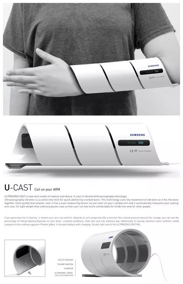 伤筋动骨一百天,可惜绷带实在太丑。富有科技感的 U-cast 固定设备的圈形结构可以通过电子控制进行微型收缩,调整到适合手臂的大小,比传统石膏固定的方式要来的更有效果。最主要的是,钢铁侠一样的造型,比缠满绷带的僵尸酷炫的简直不止一点点。