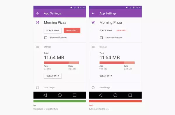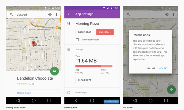 同样,在各种各样的用户界面中,也很难保证设计的一致性。但是,为了做出最好的设计,material design仍旧采用了三种不同的按钮样式。其他设计方案则有时不那么好。