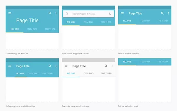 在material design设计指南中,关于页签(Tabs)的用法描述的很聪明。Material design并没有将页签(Tabs)作为表单导航来用,而是用它来作为浏览内容的另外一种方式。令人耳目一新的是,某些特定元素,比如页签工具条(tab bar),是有使用条件的。通过元素的风格及其功能,来了解制定material design的设计师的想法,从而避免滥用,这一点很好。