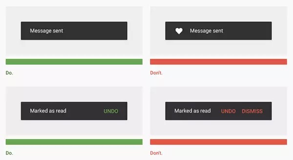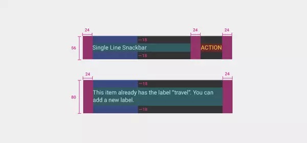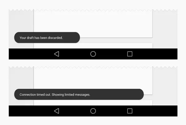但我们这里所说的更重要。Material design包括各种弹窗类型。设计语言需要这么做,因此material design就这么做了。Snackbars以及toasts和对话框很像,但还是有所不同,因此,它们是独立存在的。Material design把它们简单地区分开,因为人们需要这两种弹窗来执行不同的功能。就像material design的其他组件一样,snackbars和toasts都有详细的设计指导——用例、尺寸和颜色。