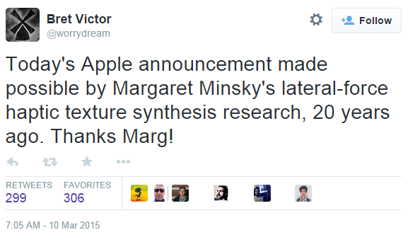 关于 Taptic Engine,WIRED 的一篇报道很有意思。它指出苹果的这种设计其实在 20 年前的实验室里就有了。3 月 10 号春季发布会之后,前苹果设计师 Bret Victor 发了这么一条推特:
