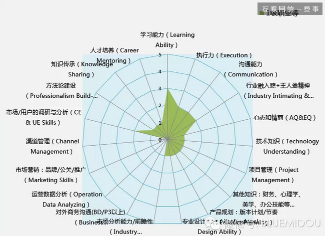 下面的图,是初级产品经理的能力要求,1级职业等,也就是1-3,这是不少产品新人的起点,随着产品经验的积累,各项能力逐步提升,这个雷达图会日益丰满,具体的演进过程,各个公司,各人自有其特色,有兴趣的,我们另外再探讨。涉及一些公司敏感内容,就不写太多了。