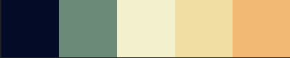 #040b27 #628a78 #f3f0cd #f1dea3 #f2b974