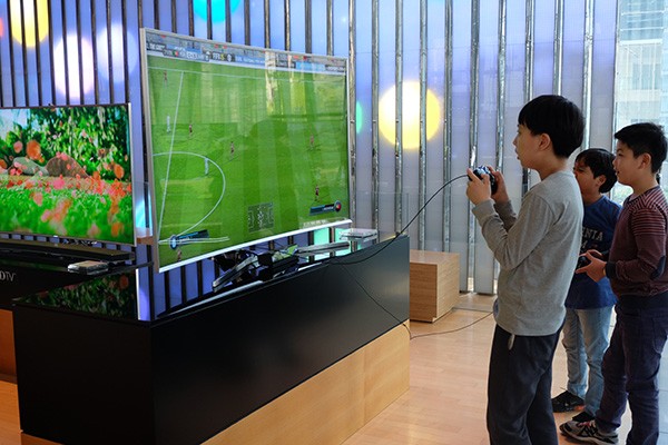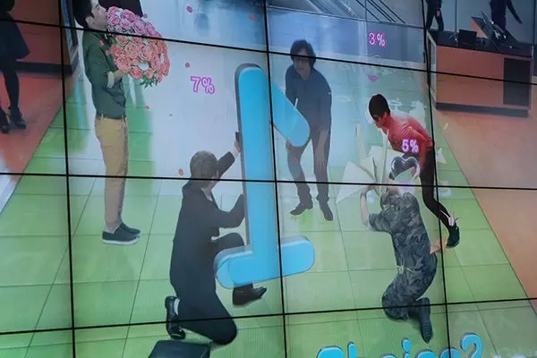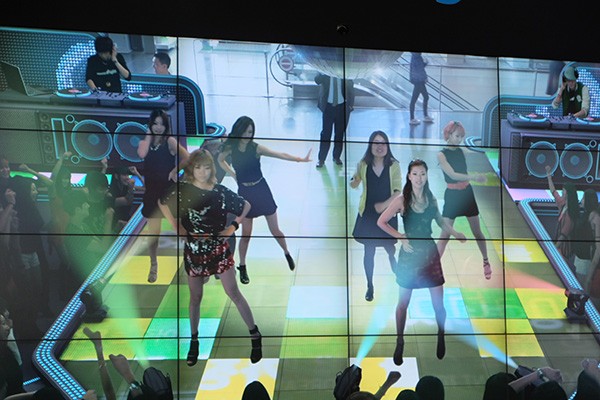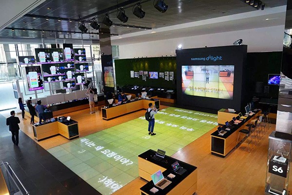 三星主展厅主墙的 LED 屏幕包括了摄像头,可以提供了一些增强现实的体验。体验者只需站在 LED 地板上随意摇动身体,大屏幕上便会自动生成体验环境。
