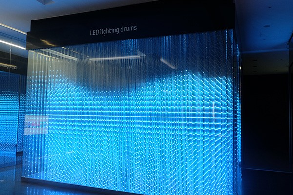 占据展厅相当大面积的是一个名为“Lighting Drums”的空间,这是一个由成千上万个 LED 灯组成的 3D LED 空间,需触摸在空间内部一面屏幕,便可以操纵不同色彩的光线。