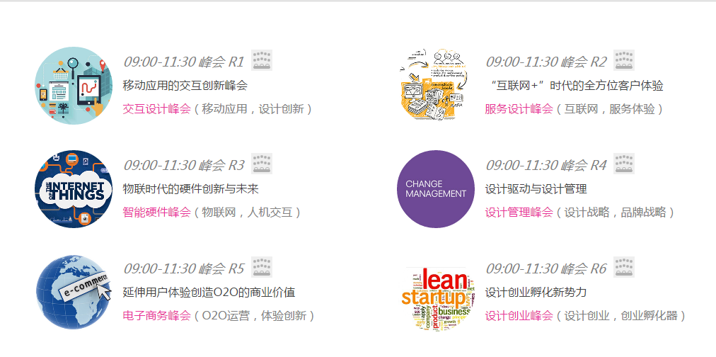 本次大会将设交互设计峰会、服务设计峰会、智能硬件峰会、设计管理峰会、电子商务峰会、设计创业峰会,围绕“互联网+”“物联网”“O2O用户体验”“设计创业”等最新热议话题,邀请30多名行业最强发言人,解读行业,把握行业发展趋势。