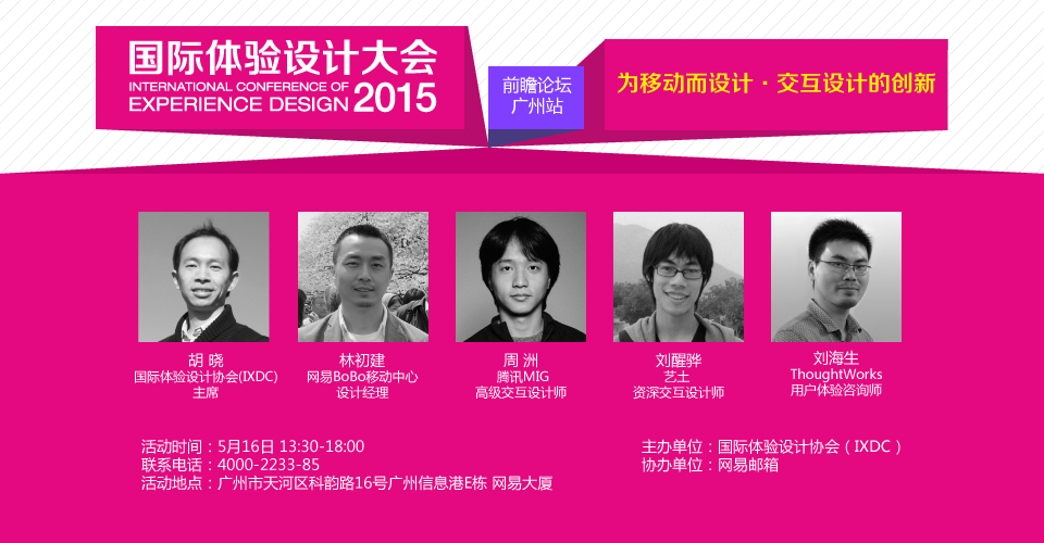 由国际体验设计协会(IXDC)主办的“2015国际体验设计大会前瞻论坛-广州站”,将联合网易邮箱于5月16日在网易大厦举行。