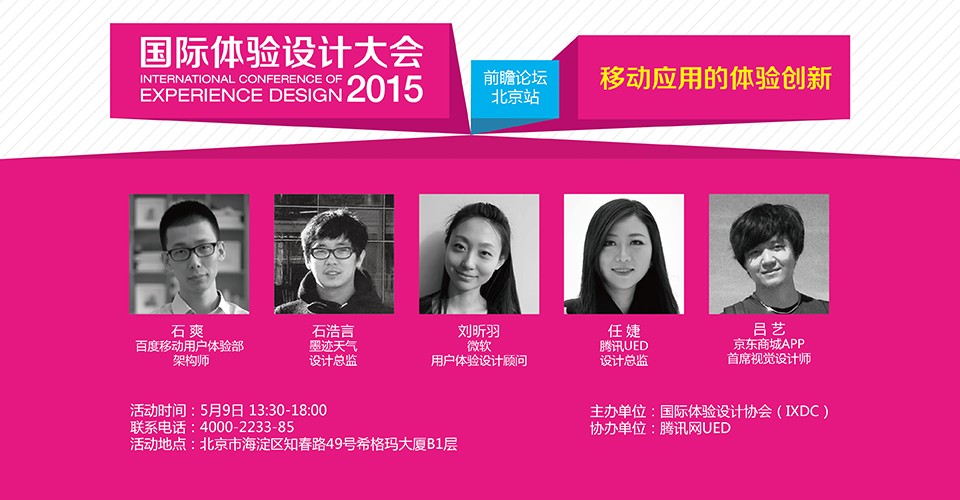 前瞻论坛为2015国际体验设计大会重要组成部分,将在全国五大城市陆续开展。本期主题为“移动应用的体验创新”,邀请腾讯、百度、京东、网易、去哪儿等企业的体验设计专家、设计师们分享与演讲。分享他们在各自项目实践中的经验与成果。参会人员可以通过此快速总结经验教训,提升改进自己的工作,获得新的启迪,同时也能结识更多志同道合的朋友。