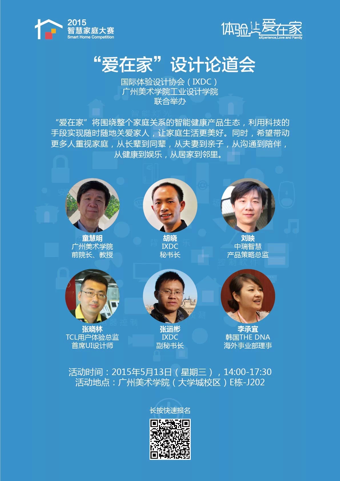 本次启动仪式不仅点燃IXDC-2015智慧家庭大赛的报名热潮,各位主讲人也将围绕对设计理解,进行“爱在家”设计论道会。TCL、韩国DNA设计咨询公司、中瑞智慧、IXDC等专家将为大家带来“爱在家”设计创新与设计思维的分享会。