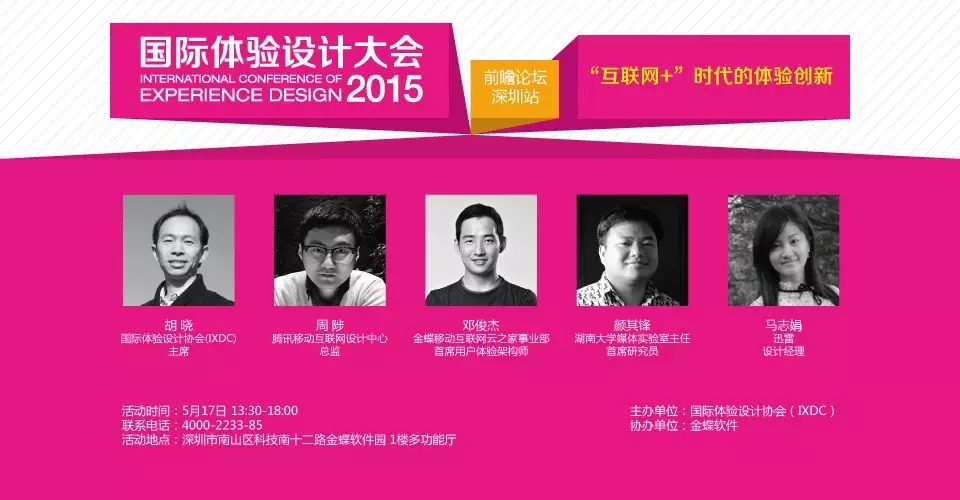 由国际体验设计协会(IXDC)主办的“2015国际体验设计大会前瞻论坛-深圳站”,将联合金蝶软件于5月17日在金蝶软件园举行。