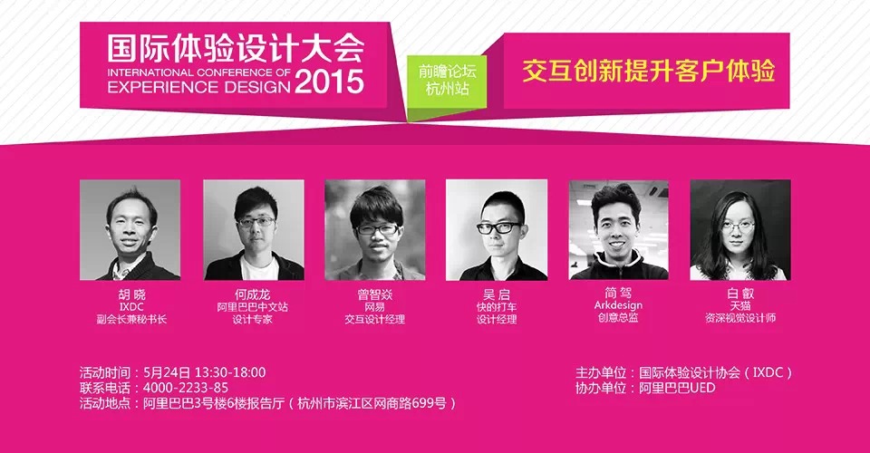 由国际体验设计协会(IXDC)主办的“2015国际体验设计大会前瞻论坛-杭州站”,将联合阿里巴巴于5月24日下午在阿里巴巴滨江园区举行。前瞻论坛为2015国际体验设计大会重要组成部分,将在全国五大城市陆续开展。本期主题为“交互创新提升客户体验”,邀请阿里巴巴、支付宝、腾讯、大众点评、快的打车、IXDC等企业的设计总监、专家、负责人前来分享他们在各自项目实践中的经验与成果。