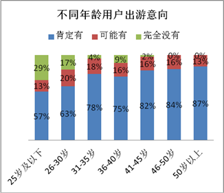 谁都想来一场说走就走的旅行,76%的用户表示肯定有,17%不确定,仅7%表示完全没有旅游意向。此外,随着年龄的增加,用户的旅游意愿更强, “银发族”的出游意愿应得到关注。