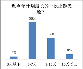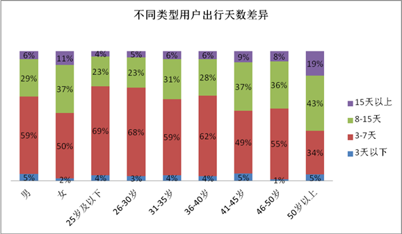 81%的用户今年计划出游1-3次,而最长出行天数主要集中在3-7天(56%),其次32%的用户表示最长出行天数会达到8-15天。不同类型用户的最长出行天数也有所差异。女性更愿意选择较长时间的旅行,同时年长用户(40岁以上),尤其是50岁以上的用户更青睐8天以上的出行。