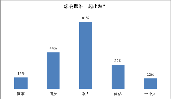 81%的用户倾向于和家人一起出游,其次44%选择和朋友一起,另有29%选择和伴侣一起。选择和同事一起或一个人出行的均较少。