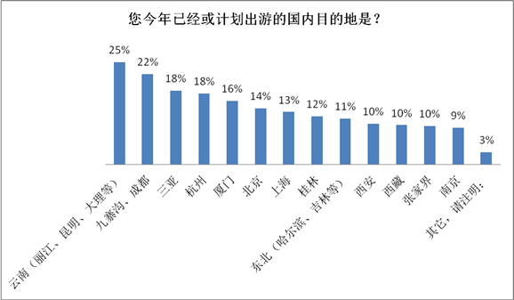 国内目的地中,超过20%的用户偏好西南线,选择了云南(丽江、昆明、大理等)、九寨沟/成都,其次有近2成的用户选择了三亚、杭州、厦门等特色旅游城市。其他目的地则分布较平均。