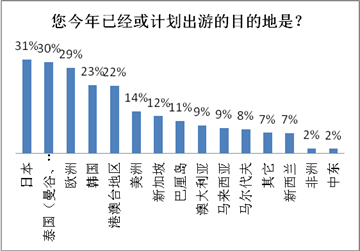76%的用户有出境旅游需求,其中用户热选的Top 5目的地依次为:日本、泰国、欧洲、韩国和港澳台。