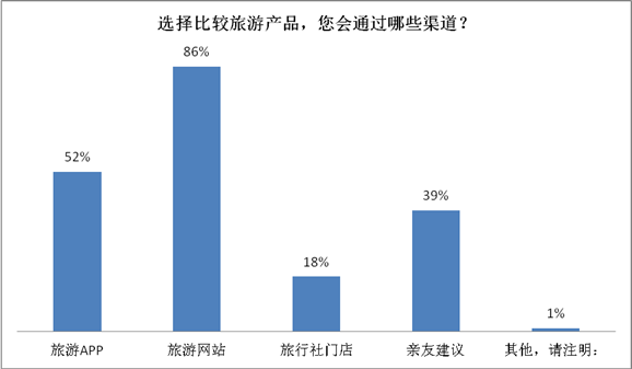 对比产品时,使用旅游APP的人数已超过半数(52%),快速崛起。86%的用户选择通过旅游网站进行对比。39%的用户会受亲友建议的影响,而去旅行社门店对比的仅为18%。