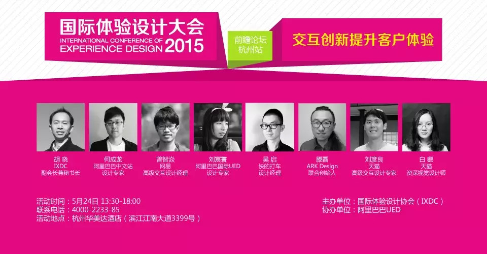由国际体验设计协会(IXDC)主办的“2015国际体验设计大会前瞻论坛-杭州站”,将联合阿里巴巴于5月24日下午在阿里巴巴滨江园区举行。前瞻论坛为2015国际体验设计大会重要组成部分,将在全国五大城市陆续开展。本期主题为“交互创新提升客户体验”,邀请阿里巴巴、网易、天猫、ARK Design、快的打车、IXDC等企业的设计总监、专家、负责人前来分享他们在各自项目实践中的经验与成果。