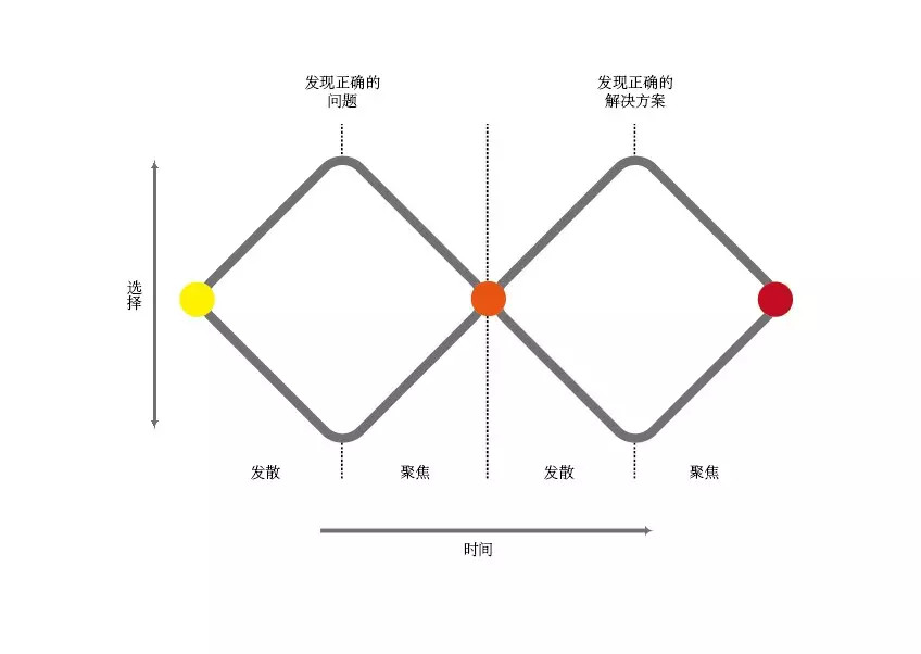 设计师经常从质疑拿到的问题开始设计之路:他们会扩大问题的范围,进一步分别检测问题之下隐藏的根本原因,然后聚焦于其中某一个问题的描述。在研究制定解决方案的阶段,首先他们扩展可能的方案,在进行一次发散思考的过程。最后,将这一切重归于某个合适的方案。英国设计协会将设计过程分为四个步骤:“发现”和“定义”,确认正确问题的发散和聚焦阶段;然后是“开发”和“支付”,制定正确方案的发散和聚焦阶段。