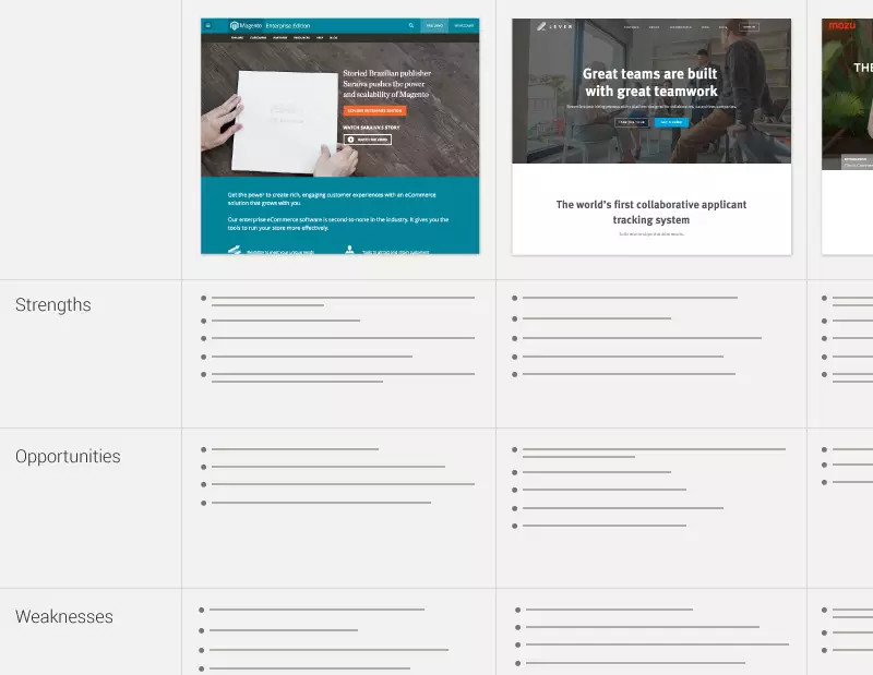 我们会对比我们和对手之间的优势、劣势,我们碰到的机遇,独有的特色,以及需要规避的问题。