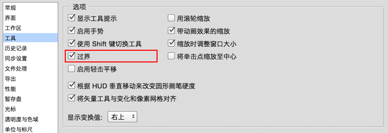 如图所示:在未打开“过界”的时候,当画布能够在界面中显示完全时,四周是不会再出现滚动条的,当打开“过界”后,即使画布缩放得很小,依然可以用小抓手或滚轮来移动画布。(在AI中一直是“过界”状态)