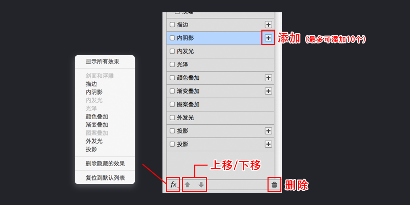 样式:设计空间中的图层颜色只保留了投影和内阴影两个,像新版图层样式一样,在这里也可以进行多个叠加的操作