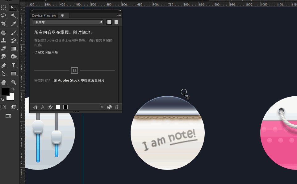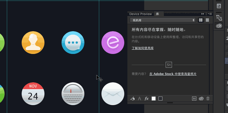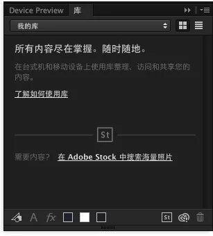 库界面——在界面上方可创建多个库用于筛选资源,下面前三个依次为添加图形、添加文字样式、添加图层样式,后面的添加颜色有点特殊,它会根据你所点选的图层状态而给出不同的功能,比如我现在点选形状图层后依次添加填充色、添加描边颜色、添加前景色。后面依次为AdobeStock、CC云同步和删除。