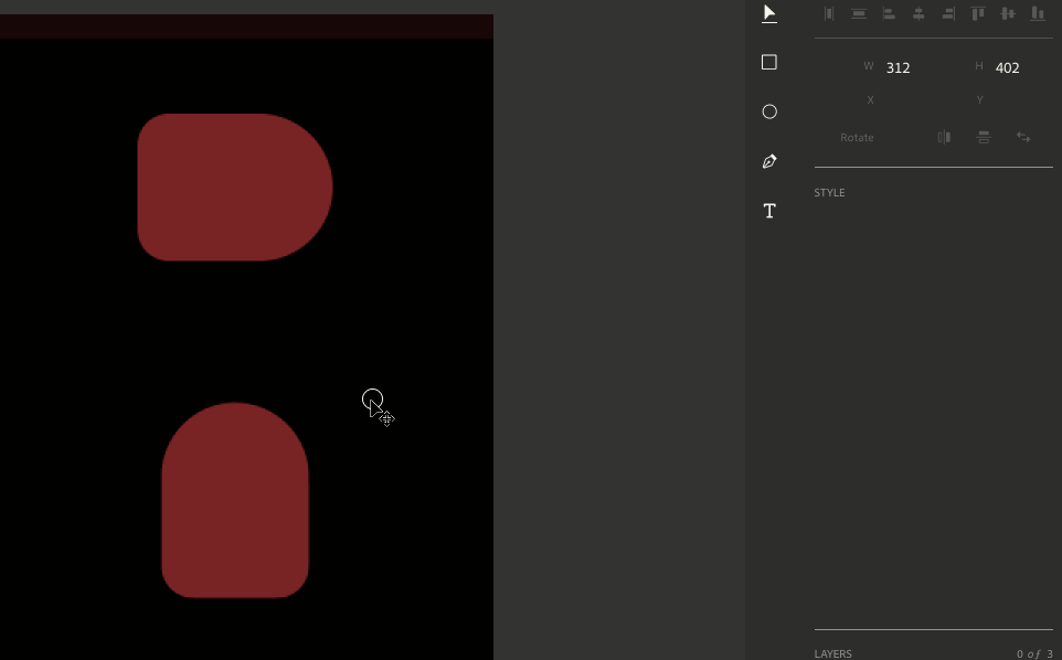 圆角和自由变换:设计空间中的形状一直属于变换状态,即随时都可以通过拖动四周锚点来改变形状的大小、形状和角度等,这一点跟兄弟软件AI再一次保持了一直(我就不说Sketch了,毕竟AI更早),旋转时中心呈现角度范围,圆角方面也可以通过右侧菜单进行快速调整,当然不规则形状的倒角依然不行(AI在CC2014.2中已实现此功能)