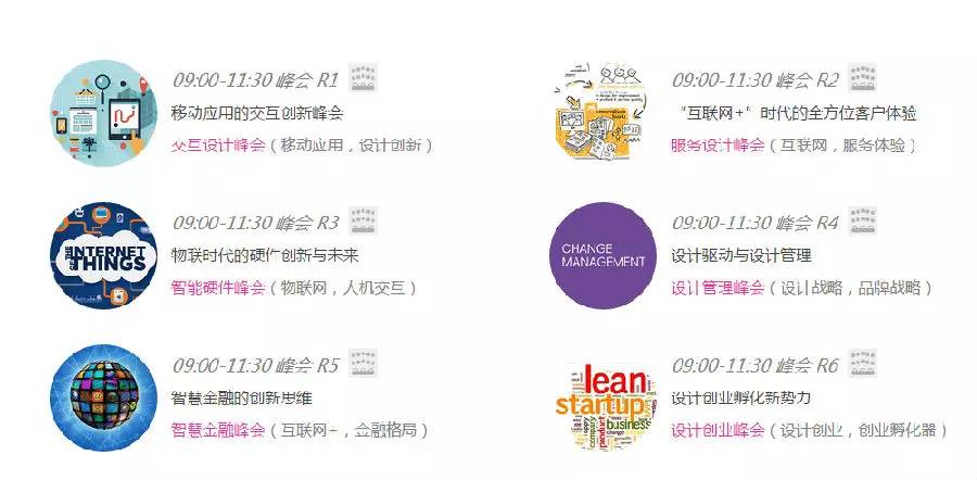 30多名行业最强发言人,邀你参与六大峰会,开启一段交互设计、服务设计、智能硬件、设计管理、电子商务、设计创业之旅,将围绕“互联网+”“物联网”“O2O用户体验”“设计创业”等最新热议话题,解读行业,把握行业发展趋势,启发互联网时代的神秘智慧。