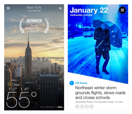 例如以设计精美著称的Yahoo的两款明星App产品Yahoo Weather!和Yahoo Digest。除了在产品设计上的极致和突出表现外,模糊和斜切的手法,给整个产品的品牌气质提升到了一个新的高度。 Yahoo Weather! 不论是在布局、字体和色彩的运用上都显得精致细腻,滑动时高斯模糊的处理更是流畅平滑。Yahoo Digest 的斜切突出一个“破”,在不影响照片内容的前提下,既能在视觉上显得与众不同,又在排版上巧妙地为色彩标签留了一角之地。比起一刀平,更显灵动而不失平衡感。
