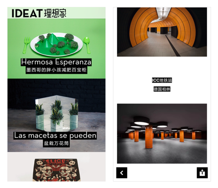IDEAT理想家App,继承了法国IDEAT杂志的理念,以展示设计、艺术和风尚的「当代生活」内容为主。App界面上除了内容图片之外,几乎没有黑白以外的其他色彩元素。通过衬以黑底的高亮白字,既是内容又是装饰,贯穿在整个App设计元素当中;调节这些文字与其他内容之间的间距,又在排版上起到作为点,作为线,甚至作为面的不同功用。