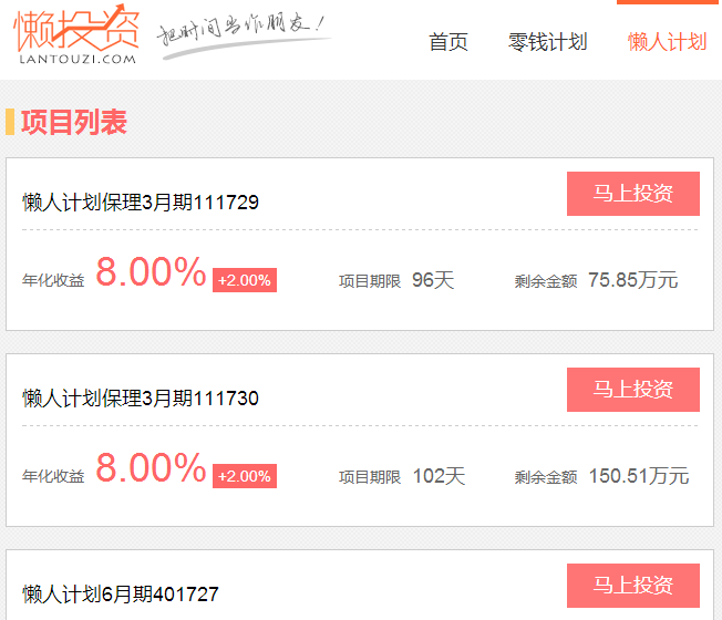 懒人计划是懒投资专为懒人打造的全新理财工具,通过严格筛选优质债权,年化收益率7%-12%,短期灵活,中期稳健,长期猛赚,更好的满足投资人多样化理财需求。