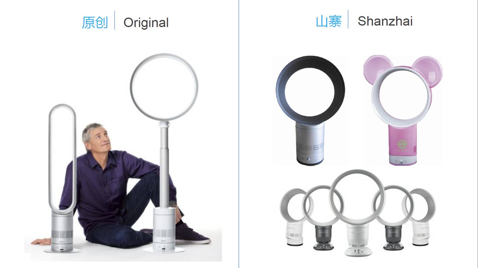 由于受到社会、当地政府的一些指责,最后不得不改变,所以在几年前从上边的logo,变成了下面的logo,改变了,再说我们山寨,我们的logo和原先的阿迪达斯不一样了,不山寨了,但是是这样吗?左边是美国正在兴起的一个品牌UNDER ARMOUR,在logo最基本的创意方式还没有跳出山寨的这种基因来。美国有原创,右边就有所谓的中国的,戴森先生发明了无叶的风扇,在中国出现了一大堆的无叶的风扇。魔音耳机在中国出现以后,就有这样一些不知道来自哪里的山寨团队,在魔声中国的一个假的网站上卖山寨的耳机,同样是在混淆消费者的视听。大家留心一下在苹果的官方上销售2498美元,右边是688,外观一模一样,但是比苹果网上便宜太多。