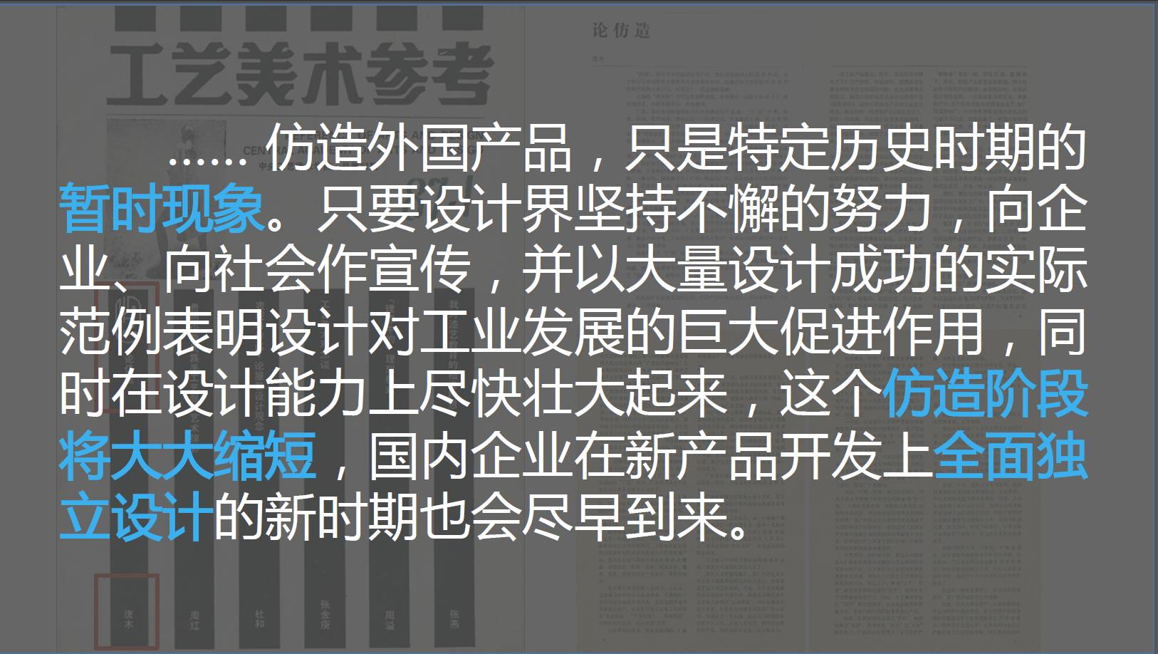 谈谈为什么我对这个话题感兴趣。28年前我为当时的中央美术学院的一份杂志写过一篇文章叫“仿造”,那时候我还很年轻,对中国的设计充满了憧憬,在这篇文章里,我写到,当中国的设计力量强大起来的时候,一定会大大的减少山寨现象,国内企业在新产品开发的全面独立设计的新时期也会尽早的到来,这是我的梦想。21年前,我主持设计的一个消毒柜在广东被20个企业模仿,打了2年4个月的官司,在当时的中国是很大的一场外观保卫战,而我个人对中国的模仿问题有了很深切的认知和体会。