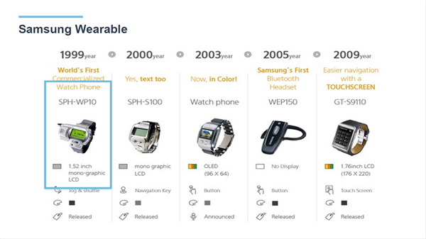 其实我们很早以前想象过有没有智能可穿戴的手表,这是三星从1999年到现在一代又一代推出的电子表。三星可穿戴设备也并不是大范围受到大家的追捧,很多人还没用,但是已经是良好的开始了。