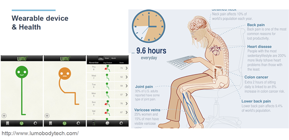 给大家举一个例子,我们有一个应用坐姿,一天当中坐太久会给你心脏带来负担,而且有可能会生癌,所以不要光坐着,站起来动动,步行是非常重要的运动。很多时候人们坐得太久,坐的时候姿势不够标准,如果坐姿不对会带来负担,用这样的可穿戴设备可以搜集坐姿和数据。数据可以告诉你一天坐了多久,就像步伐计算一样。最大的挑战是如何从数据当中发现,为大家带来好处。告诉你一天坐了多久,或者是给你一个警示你要站起来,或者是坐得太弯,你要美美的坐直。这边有不同的可穿戴设备在健康方面的应用,可以给大家进行一些运动的建议,或者说给你运动的反馈等等。