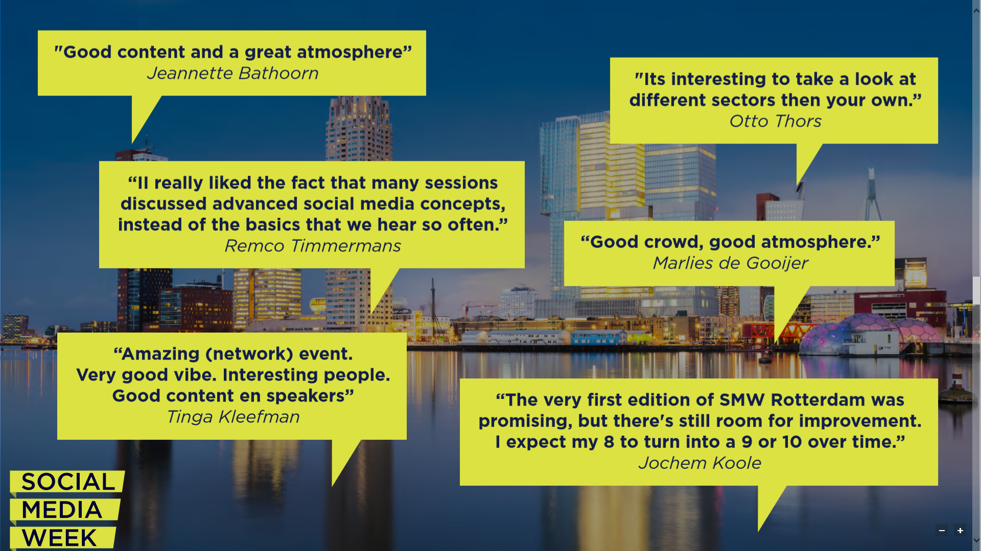 社交媒体周(SMW)是一个主流新闻平台和世界范围的大会,创造及分享社交媒体和技术是如何改变世界的商业、社会和文化的最佳理念、创意和见解。人类的连通性正在被重新构想,而SMW追求的是理解人性与技术如何结合来改变我们生活、工作和创造的方式。SMW在六大洲举办大会,包括欧洲、北美洲、南美洲、非洲、澳大利亚和亚洲。