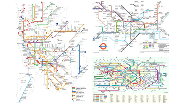 现在通过我们的设计,在不同界面上给高效率的体验,包括机场通过系统快速托运行李,办理登记牌等等,很快通过安检,大家都是一样的。大家知道通过新的电子系统可以很快自我打印登机牌,可以托运行李,不用人工服务。这个受到大家的追捧。而且在机场里越来越舒服,因为有很多商业模式引进到北京的首都机场,如果看这两幅图,可以看出不同吗?你觉得有什么不一样吗?原则在哪里呢?原则就是我们通过这样的设计能够让消费者们觉得我到这里不仅仅是简单到机场登机,在这里可以体会到完全不一样的商业环境,在这里我觉得舒适。我可以给你展现几个城市的地图,这是地图的线路图,像蜘蛛网一样。在纷繁复杂的蜘蛛网你能够很快找出目的地吗?不太容易。在同质化的情况下,如何追寻最好的方式,让消费者能够觉得拥有很好的体验,不需要太复杂,可以马上找到。无论是美国、欧洲、亚洲消费者的体验是一样的,消费者都有同质化。