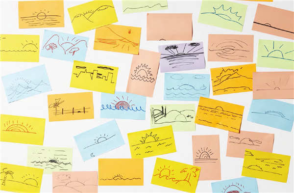 分享几个数据,每天有十亿人上传,存储400兆,能够带来800万,这其中涉及很多人。在这样的BOX里面,我们团队总共有85个设计师,他们负责包括互动设计、视觉设计、品牌设计等等。大家一起来做一个练习,一起玩一个游戏,每个人拿一张纸拿一张笔。这一秒钟大家是属于同一家公司,这是2000人的公司,现在的你有30秒完成一幅图,我是你们团队的经理,现在我们公司要一起完成一个任务,你有20-30秒完成一幅日落图。