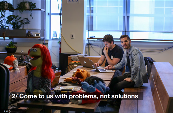 我们要带着问题来,而不是结论。设计师要想我们有什么问题,而不是我已经决定,不管他人。我们心中有一个问号,到底我们要怎么做。通过头脑风暴一次又一次的检验,通过所有人的想法得出来的结论,我相信才会更加科学,对于我们公司来说我们永远没有落下这个很好的公司文化,无论是经理,还是总经理,还是设计员,每个人都是带着问题来,而不是带着结论来。我们没有终极英雄,终极英雄就是我们大家。我们带着问题来就不会颐指气使,我们带着问题来就寻求共同的理解达成共识,这种方式才会最终形成最好的结果。在这个过程中不同人有不同的看法,通过不同的视觉,通过不同的立场,我们得出来共同讨论,在这个过程中我们互相学习,而且在话题上进行不断的探索。